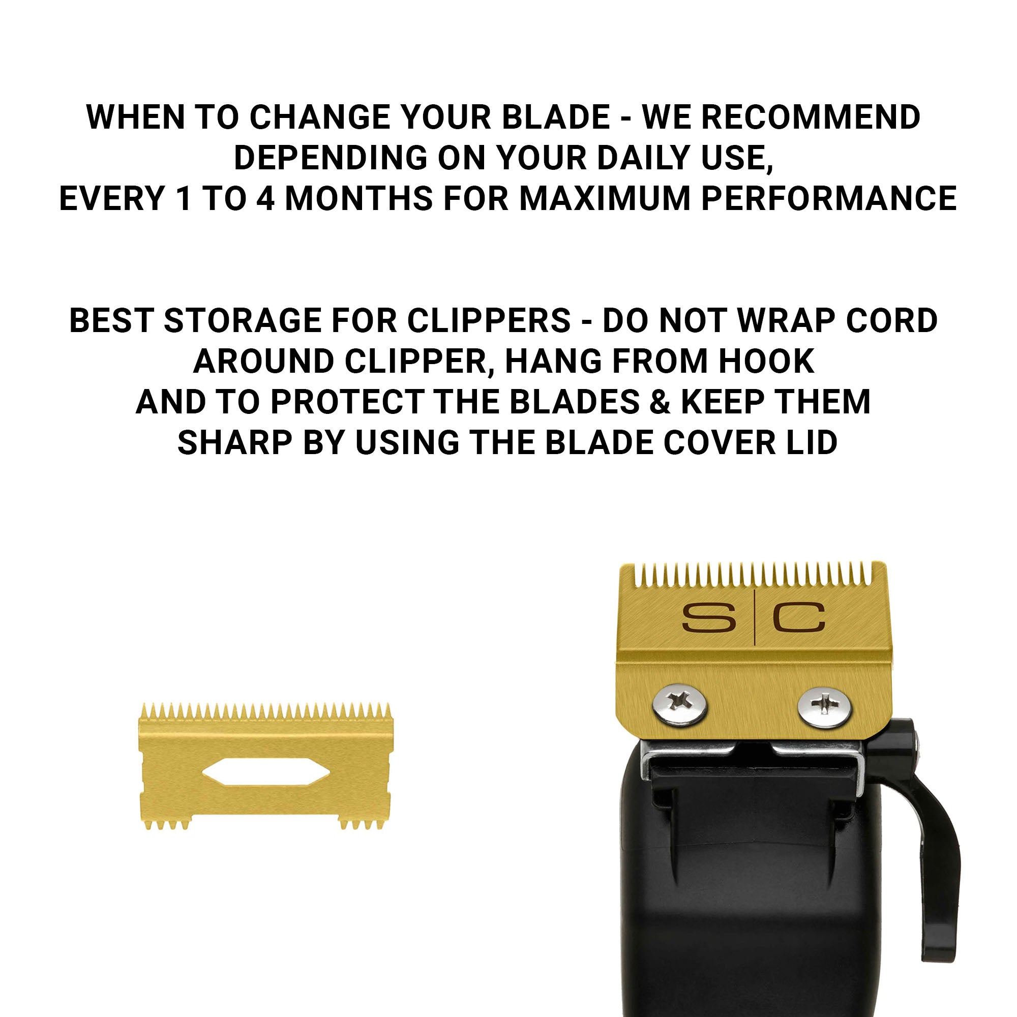 To maintain top performance, it is recommended to replace the blades every 1 to 4 months, depending on usage. For optimal storage, avoid wrapping the cord around the clipper and always use the provided blade cover to protect the blades from damage. Cleaning is straightforward: simply brush the blades with a maintenance kit brush or use compressed air to remove any debris, oil the blades, and wipe with a dry cloth. The gold titanium blades are not only durable but also easy to maintain, ensuring they stay sharp and in peak condition for longer. For professionals seeking a reliable and high-performance clipper blade, the SC Clipper Blade Gold Fade Blade & Gold Slim Deep Blade Set is an excellent choice.
